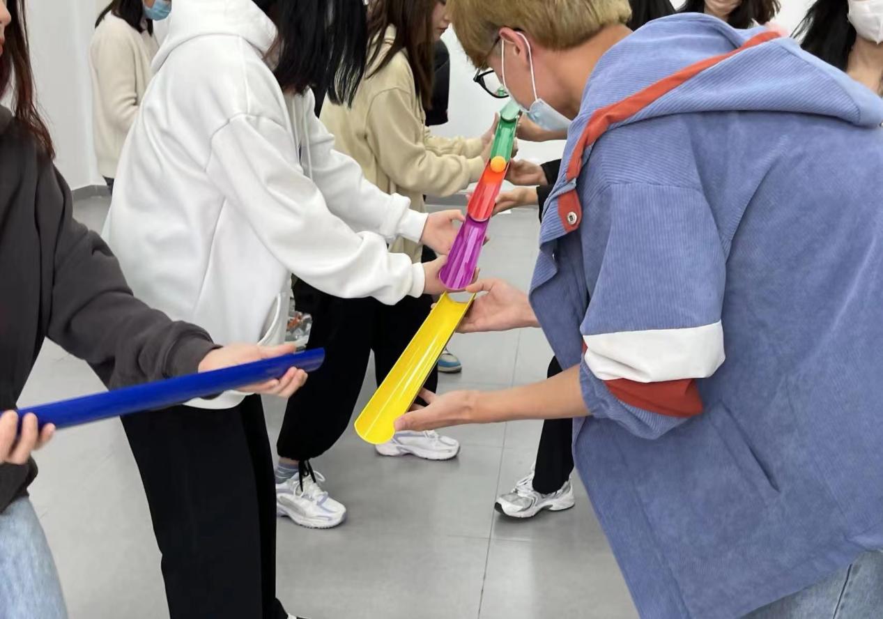 此次活动由心理健康中心黄云衡与林艳婷两位老师主持,并邀请来自新闻播音系21级播音与主持四班心理委员唐晓婉同学担任活动助手。在正式活动开始前,每位同学轮流介绍自己,互相认识,并遵循男女搭配的原则把24名同学分为3个活动小组。主体活动以小组竞赛的形式完成了“巧接彩珠”与“能量传输”两项趣味横生又考验团体协作的经典素质拓展游戏。在游戏练习阶段,各小组积极商讨游戏策略,争分夺秒进行练习,为正式比赛做准备。正式比赛阶段,三个小组正式进行比拼,气氛紧张又激烈。而在分享环节,大家不仅分享了成功的秘诀,还主动分析失败的原因。两位老师对大家认真积极的态度表示高度的肯定,并给每一位参与活动的同学发放小奖品作为纪念。