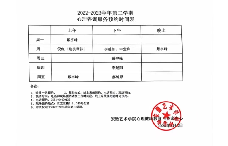 2022-2023学年第二学期心理咨询服务预约时间表