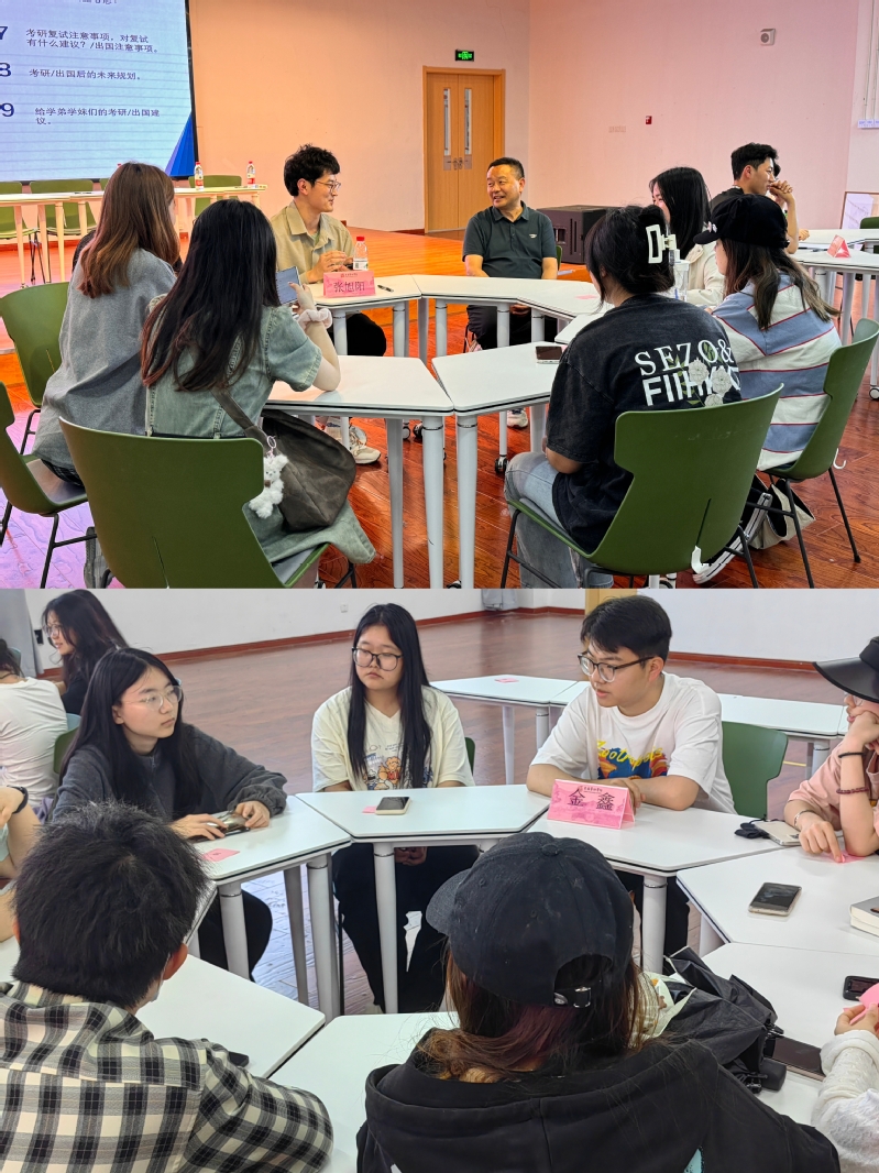 本次考研交流圆桌会创新了交流形式,由台上集中经验分享与台下单个圆桌交流相结合。在集中分享环节,洪思怡、汪厚传、金鑫、张旭阳4位成功考研学生,依次讲述了自己的考研历程,以及围绕考研准备、择校技巧、备考方法、未来规划等学生比较关注的考研问题进行了解答,并结合个人经历与亲身体会给予经验分享;章辰坤、黄欣羽2位成功出国留学学生,就留学准备、出国注意事项等方面进行分享,并针对雅思、托福备考技巧等进行了详细的介绍,为同学们提供了宝贵的建议。