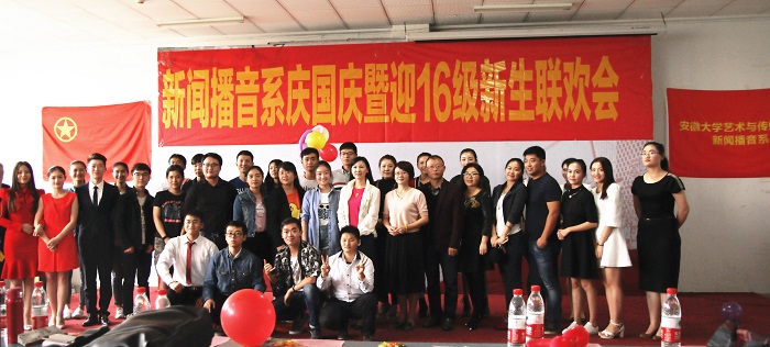 9月29日下午,在学院一号教学楼第二阶梯教室里,歌声飞扬、掌声欢呼声此起彼伏,新闻播音系在这里举办“庆国庆暨迎16级新生”联欢会。院团委书记陈明、音乐舞蹈系主任孙来法、新闻播音系副主任王琍琍、党总支副书记张志云、办公室主任刘涛及部分老师莅临现场和16级100名新同学观看了演出。