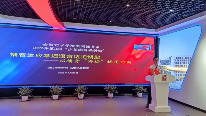 4月26日晚,新闻播音系在播音楼五楼VR新媒体党员活动中心举办了2022年第2期“少荃湖传媒讲坛”。特邀浙江传媒学院石艳华副教授为广大师生做了一场题为《播音生应掌握语言学这把钥匙——以播音“停连”运用为例》的线上讲座。新闻播音系副主任尹广富主持此次讲座活动。
