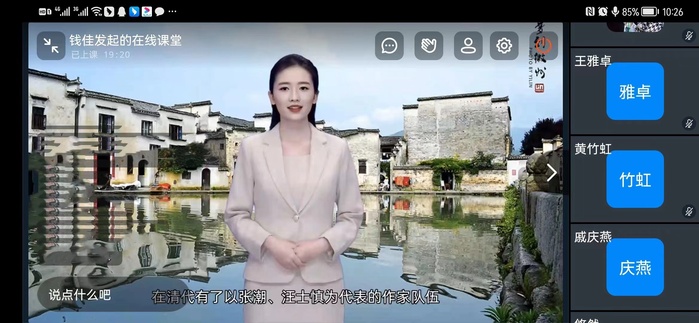 本次线上课程是钱佳老师主讲的《徽文化研究》,课程内容结合传统教学内容和现代教学手段,运用虚拟数字人技术进行课程内容讲解和分析。