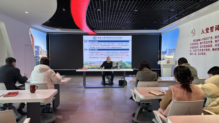 钟军从新时代高校二级学院党建工作的新要求、高校二级学院党建工作的现状及问题、合工大仪器科学与光电工程学院党委党建双创工作三个方面进行讲解,为传媒学院党总支成员详细介绍了党建工作经验。