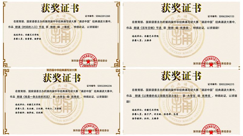近日,教育部公布了第四届中华经典诵写讲大赛获奖名单。传媒学院播音与主持艺术专业教师张雷雷、杨梦姣朗诵的作品《时间的入口》(节选)以安徽省教师组一等奖挺进全国决赛,并最终荣获教师组一等奖的佳绩。