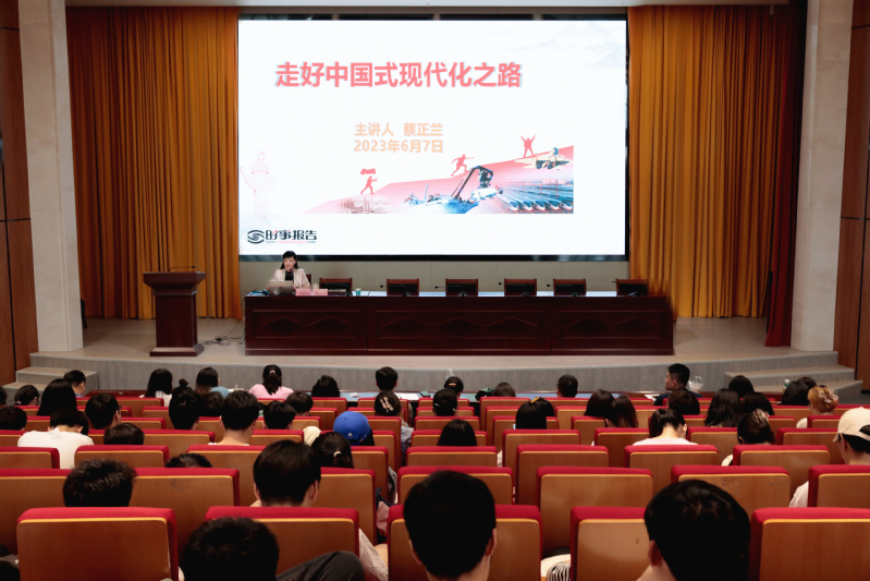 6月7日下午,传媒学院党总支书记、院长蔡正兰在综合楼5楼报告厅为传媒学院2020级本科班的221名学生上题为“走好中国式现代化之路”的《形势与政策》课。传媒学院全体教师到现场聆听。