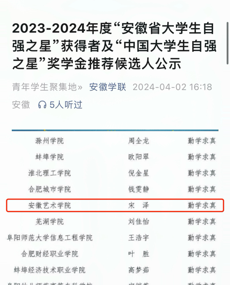 近日,安徽学联公布2023—2024年度“安徽省大学生自强之星”获得者名单,我院2021级播音与主持艺术2班宋泽同学荣获勤学求真类“安徽省大学生自强之星”个人称号,为我校历史性突破。