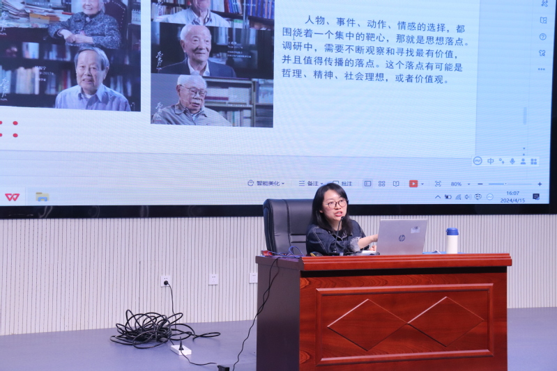 在讲座中,鲁慧以田野调查为主题,首先向同学们介绍了田野调查的重要性和特征,结合自身工作经历,为同学们讲授了“该如何做好田野调查”,同时结合具体作品进行展示开展田野调查的方法。她提醒同学们,拍摄纪录片的过程中要关注社会问题,提高社会责任感。讲座不仅拓宽了同学们的知识面,也为随后的采风活动作了理论准备。