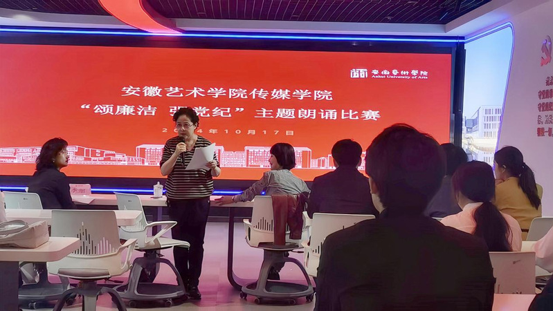 10月17日下午,在热烈的掌声和激昂的朗诵声中,乐动网官网“颂廉洁强党纪”主题朗诵比赛传媒学院现场赛在播音楼五楼廉政教育中心圆满落下帷幕。本次现场赛特别邀请原安徽省话剧院院长、国家一级演员朱海燕,安徽广播电视台新闻中心播音部主任、播音指导杨锦,安徽广播电视台资深节目主持人、播音指导李丽三位业界专家担任评委。
