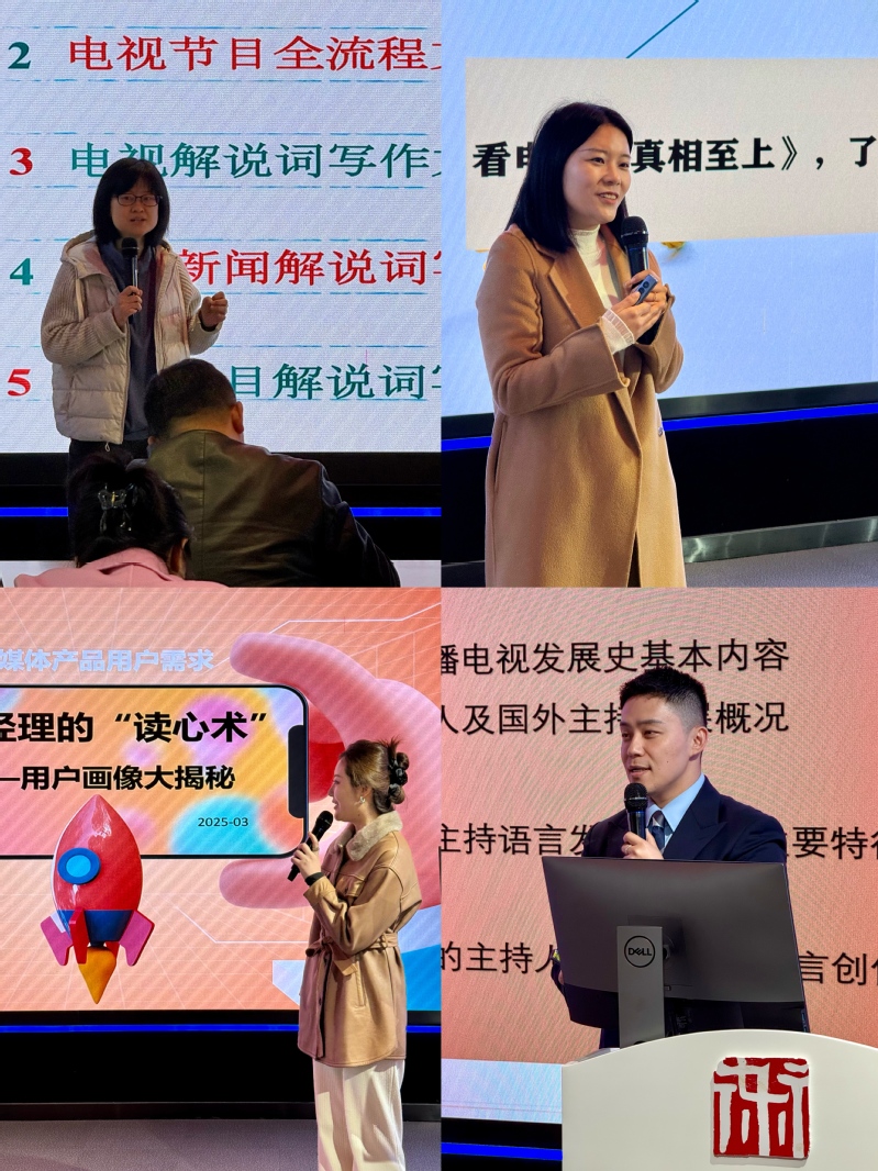 活动中,影视摄影与制作教研室的王荔挺老师从知识传递、职业养成和素质教育三个层面,就电视节目全流程文案写作与教学思路进行了精彩的讲授;新闻学教研室的张蕊老师,讲述了“新闻自由与真相至上”理念与国家安全之间的辩证关系;网络与新媒体教研室的刘思佳老师从产品心理角度,介绍了用户画像的性质与模型构建方法;播音与主持艺术教研室的宋秋熠老师运用意象具体法、音律锚点法与结构模块法的三重方法,介绍了将书面文本话语转换为记忆载体的编码方法。