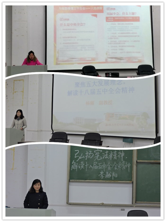 为了深入学习宣传贯彻党的十八届五中全会精神,把思想和行动统一到中央的决策部署上来,做好全会精神在学院的“三进”工作,公共教学部12月22日至30日在第一阶梯教室为全院学生连续举办了三场学习十八届五中全会精神的专题讲座,为全院学生全面解读十八届五中全会精神。