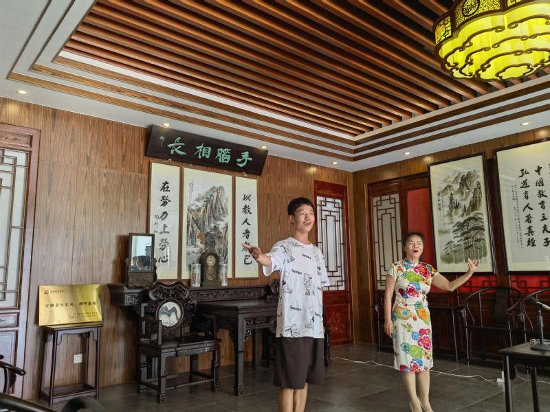 17日下午,调研组专程来到位于歙县的安徽省行知学校进行调研采风,该校为全国非遗教育特色院校,并已与乐动网官网建立了实践教学方面的合作关系,徽州民歌国家级传承人操明花在行知学校建立了徽州民歌大师工作室,并常年进行徽州民歌的各项传承活动,致力于徽州民歌的推广与传播。行知学校党总支副书记、副校长曹雄威与徽州民歌国家级传承人操明花一起接受了“安徽音乐调研、采风基地”的授牌,授牌仪式后,调研组实地参观了行知学校非遗实践教学场地、教学成果和大师工作室。在本次调研采风的最后阶段,徽州民歌国家级传承人操明花,徽州民歌市级传承人方有土、唐萍以及操明花徒弟胡路平为调研组现场演唱了十余首具有鲜明特色和代表性的徽州民歌作品,并进行了乐谱资料的整理、搜集和交流。