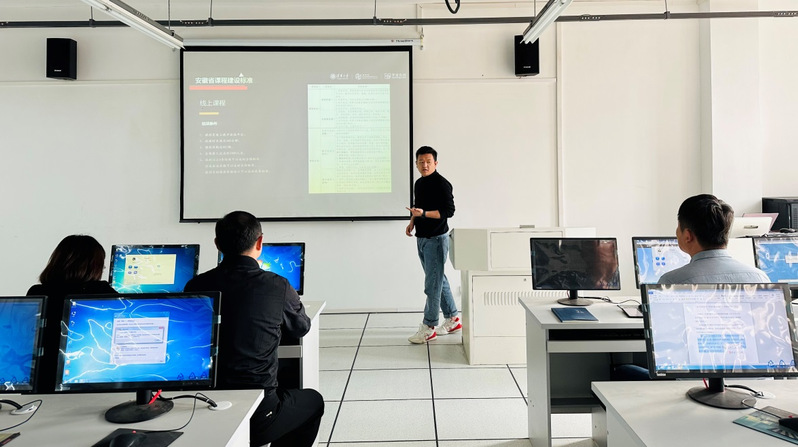培训邀请了清华大学学堂在线课程部负责人作主题报告。报告结合音乐学院实际情况,从安徽省课程建设标准解读、课程视频建课流程及智慧教学平台开展信息化教学等几个方面展开。