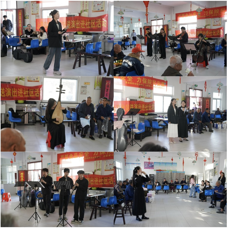 慰问活动中,“文艺轻骑兵”不仅表演了女生独唱《如愿》《我和我的祖国》、竹笛独奏《挂红灯》、弦乐四重奏《瑶族舞曲》、单簧管三重奏《千与千寻》、琵琶《草原小姐妹》等精彩的文艺节目,还专门为老人们准备了牛奶、水果等慰问品。