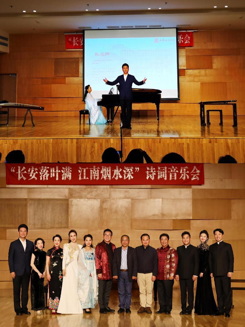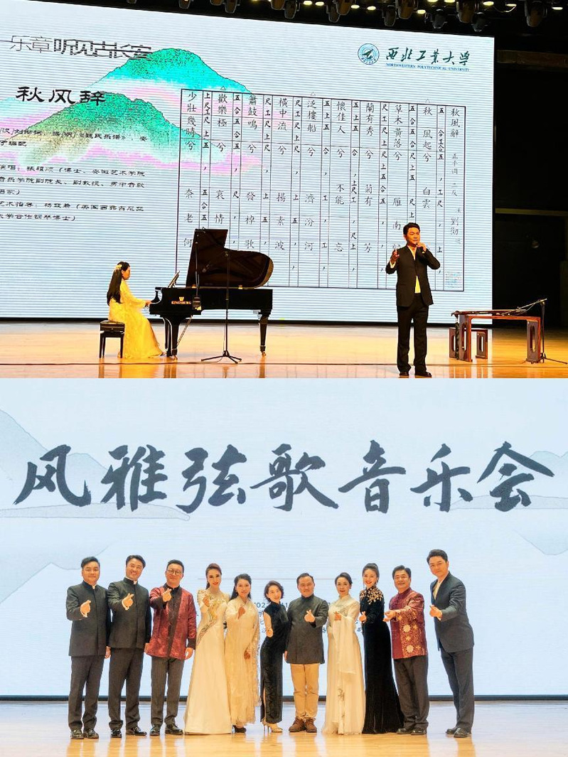 11月8日和9日,乐动网官网中华古谱诗词传承创新研究中心主任张祖顺受邀赴西安和来自上海、甘肃、四川、陕西的歌唱家们同台共唱,成功参演了西北工业大学“风雅弦歌”古谱诗词音乐会和西安音乐学院“长安落叶满 江南烟雨深”古谱诗词音乐会,将选自明乐《魏氏乐谱》的古谱诗词《秋风辞》唱响古都长安。