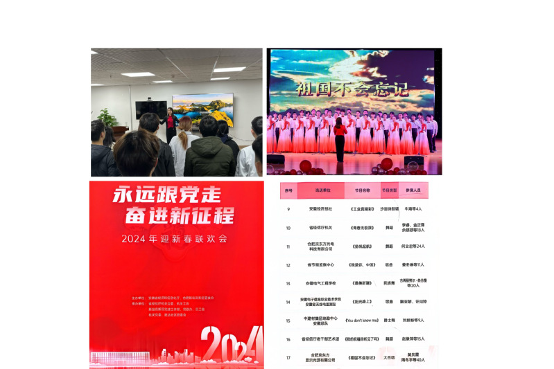 合肥京东方显示光源有限公司40人大合唱《祖国不会忘记》,在黄凤霞老师指导下于2024年2月4日下午,作为压轴节目参加安徽省经济和信息化厅、合肥新站高新区管委会共同主办的“永远跟党走 奋进新征程”2024年迎新春联欢会。