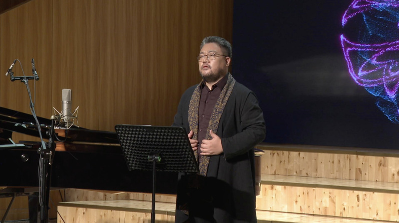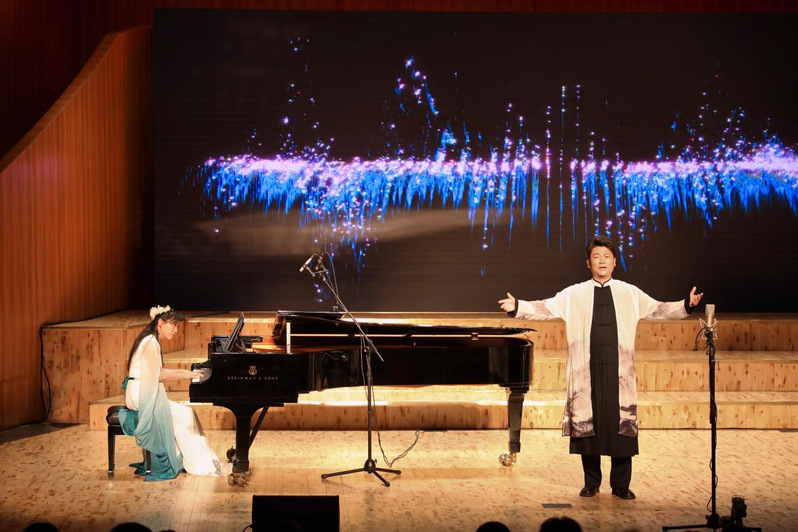 另外,本场音乐会还主打音乐与科技深度融合,在大屏背景多媒体呈现上创新突破。将研修班学员提前集体朗诵歌曲对应诗歌的音频进行高科技处理,生成“钢琴伴奏”演唱版本的现代抽象动态大屏背景;运用AI生成古谱诗词“民族室内乐伴奏”演唱版本的古风动画背景图像。在现代与复古的碰撞中,让观众感受古谱诗词与时俱进的创新与发展。