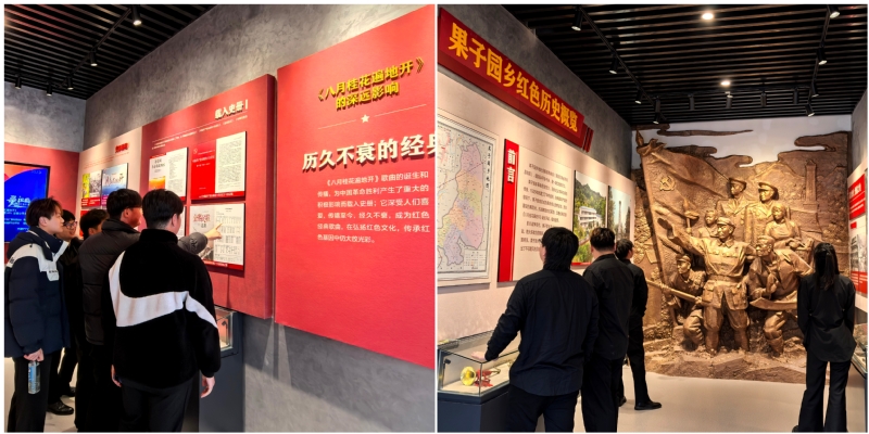 随后,全体师生前往《八月桂花遍地开》诞生地的历史文化纪念馆与果子园乡红色历史陈列室参观。在佛堂坳小学老师的生动讲述下,大家了解了革命歌曲《八月桂花遍地开》的创作背景,以及金寨作为革命老区的重要历史意义。通过一件件珍贵的文物与详实的历史资料,师生们重温了先烈们不畏艰险、不怕牺牲的革命精神。