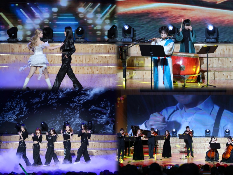 在活力四射的舞蹈串烧之后,迎新晚会正式开始,歌曲《小酒窝》《火鸟》《租购》《敕勒歌》让晚会高潮迭起、管弦合奏《白色巨塔》、国乐合奏《象王行》让大一新生领略高年级同学的精彩表演,由2024年度未来之星同学联合演唱的《如愿》《蓝莲花》展现了优秀学子的风采,为大一新生树立了良好榜样。由24级国乐班李俊杰带来的快板《天安门广场看升旗》,让师生们领略了五星红旗在天安门广场升起的庄重意义及背后的革命情怀。晚会最后,由全院领导与教研室主任合唱的《明天会更好》将晚会推向了高潮。晚会还融入了抽奖和毕业班优秀学子颁奖环节,台上台下互动与交流让晚会更加丰富精彩。