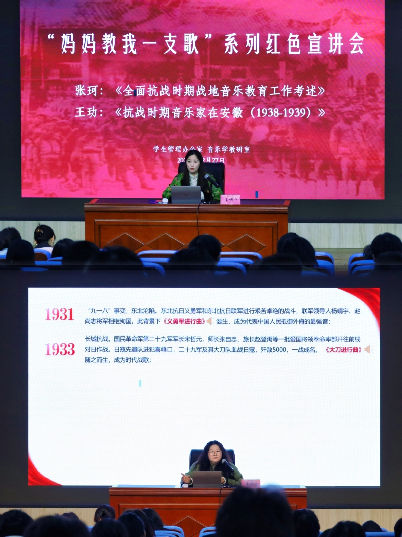 2024年12月27日,音乐学院“妈妈教我一支歌”红色系列讲座第一期在音乐南楼报告厅如期举行。“妈妈教我一支歌”是音乐学院学生管理办公室的特色品牌活动,作为学院红色文化教育的重要组成部分,与学生党支部的“唱支山歌给党听”红色音乐会相互呼应,旨在通过理论宣讲与实践音乐会相结合的形式,增强新时代大学生的爱国情怀,坚定理想信念。