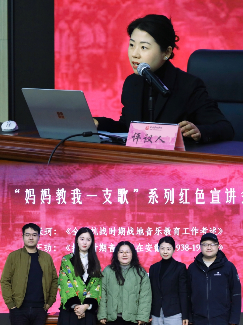 下半场由音乐学教研室专任教师王玏主讲,题目为《抗战时期音乐家在安徽(1939-1945)》。王玏老师详细介绍了何士德、孟波、任光、晓河、章枚、洛辛、贺绿汀等音乐家在抗日战争期间,在安徽组织音乐活动、创作抗战音乐作品、普及新音乐理论的事迹。她特别指出,尽管安徽相较于重庆、桂林等抗战音乐文化中心城市在地理位置上处于边缘,但这些音乐家的辛勤创作和普及工作为抗战宣传作出了巨大贡献,丰富了安徽的抗战音乐文化。