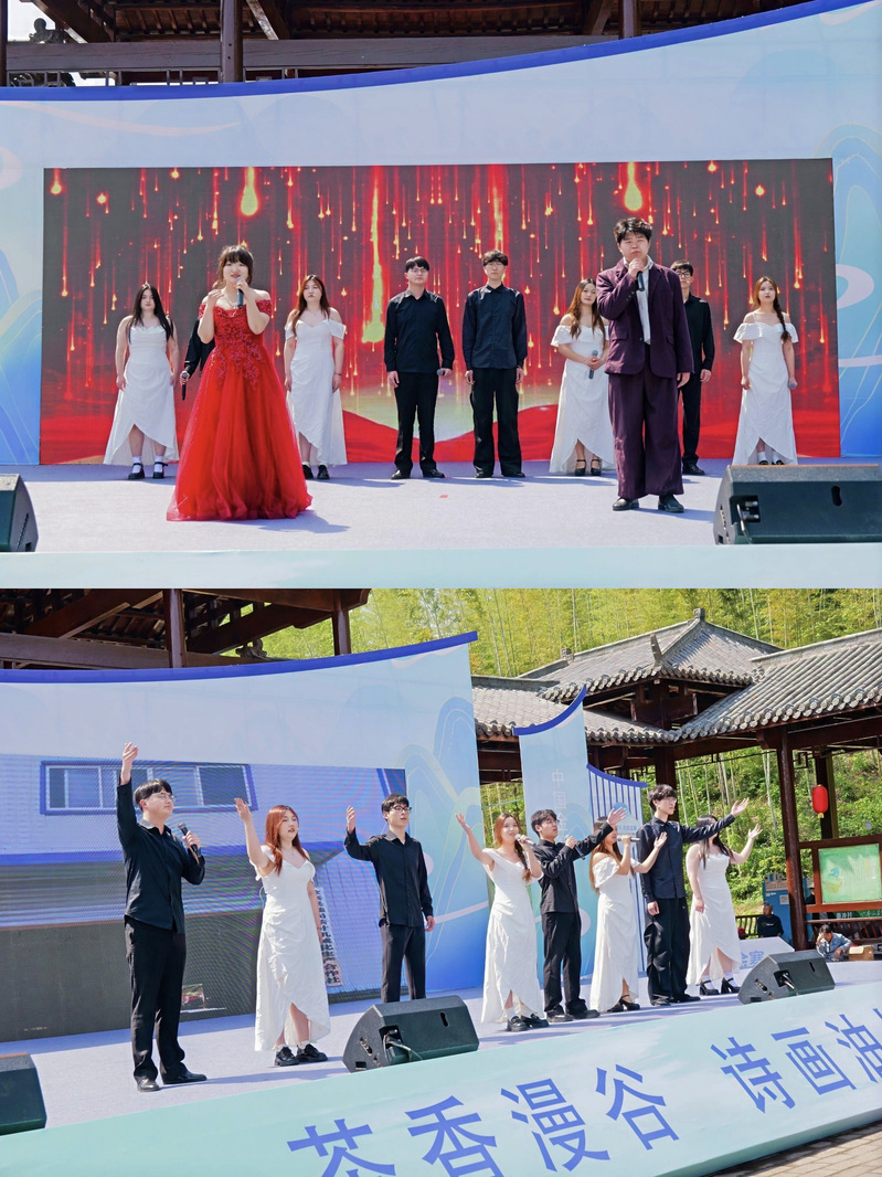 活动现场,“文艺轻骑兵”表演了歌曲《幸福面冲》,与茶香、山水共谱乡村振兴新篇章。此外,茶园旗袍秀、围炉煮茶、书法绘画等沉浸式体验项目,让游客在茶香中感受传统文化与现代审美的碰撞。