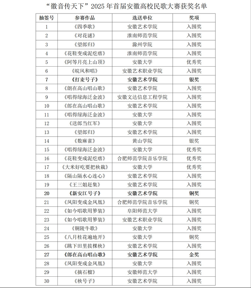 2025年6月11日,乐动网官网音乐学院音乐表演声乐专业学生在安徽省音乐家协会和安徽大学艺术学院联合主办的“徽音传天下”2025年首届安徽高校民歌大赛决赛中再创佳绩,荣获金、银、铜奖各一名,决赛入围奖八名。
