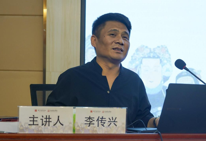 李传兴邀请到安徽省徽京剧院一级演员、《水淹七军》中周仓的扮演者谷化民来到课堂。