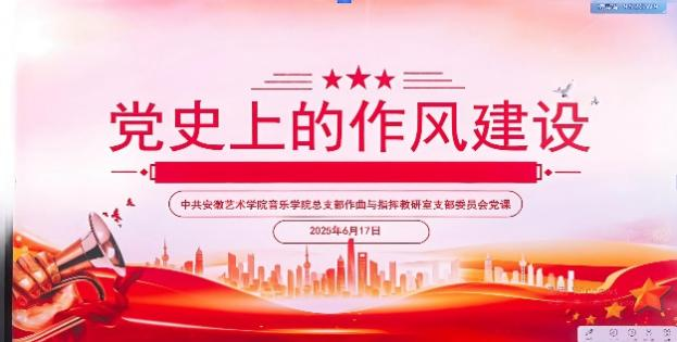 2025年6月17日,作曲与指挥教研室党支部组织开展了“党史上的作风建设”主题党课活动,由音乐学院副院长张祖顺主讲,教研室全体党员共同参与学习。
