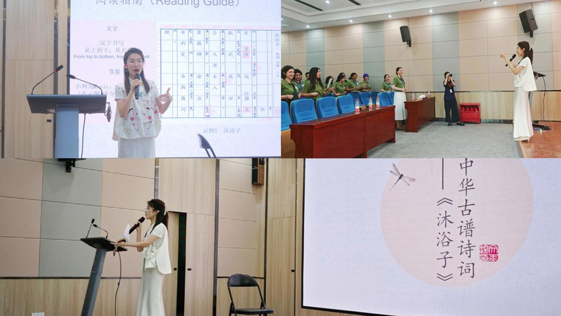 谢潘婕全程采用英语授课,向国际学生深入阐释了中华古谱诗词的定义、特点、音乐风格以及明代古谱诗词《魏氏乐谱》的历史源流。她带领学生们集体学唱由中华古谱诗词传承与创新研究中心翻译创编的古谱诗词《沐浴子》,以音乐作为媒介,诗词作为桥梁,用中华古谱诗词的教学实践,推动中国声音的全球化传播。