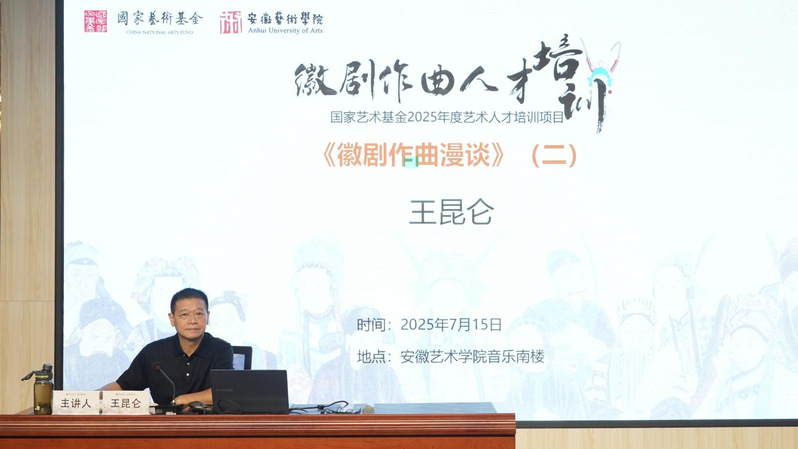 课程延续徽剧作曲原材料分析的脉络,从唱腔音乐展开详述。剖析徽剧江西路子与安徽路子的异同,探究不同流派在作曲上的差异,为理解徽剧音乐多样性奠定理论基础。针对四平调、二黄西皮等传统腔体,结合“网红渔翁” 等实例进行作曲实践分析,清晰呈现传统腔体的运用逻辑。课程还对过场音乐与锣鼓音乐展开分析,王昆仑以自身创作作品为例,进行徽剧作曲实践分析,详解作曲技术手法,形成从理论到实践的完整学术链条,为徽剧作曲的传承与创新提供了有力的学术支持。