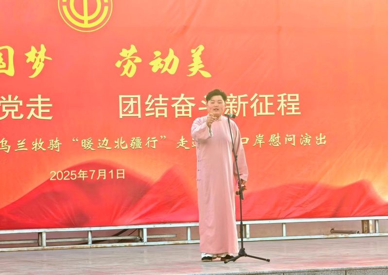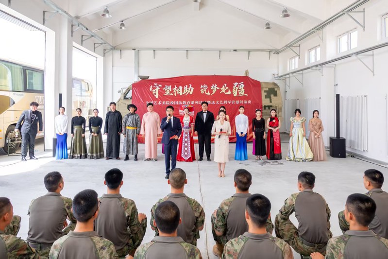 音乐学院学管办副主任淳于义龙、教师闫奇带领学生深入边疆一线,以天为幕布、以地为舞台,为戍边官兵献上了一场场饱含深情的演出。快板《天安门广场看升旗》节奏明快、情感真挚,唱响了青年一代的爱国情怀;经典歌曲《鸿雁》悠扬婉转,传递了对边防战士的崇高敬意。师生们以“短小精悍、灵活多样”的演出形式,践行了乌兰牧骑“扎根基层、服务人民”的精神内核,赢得官兵们的热烈掌声。