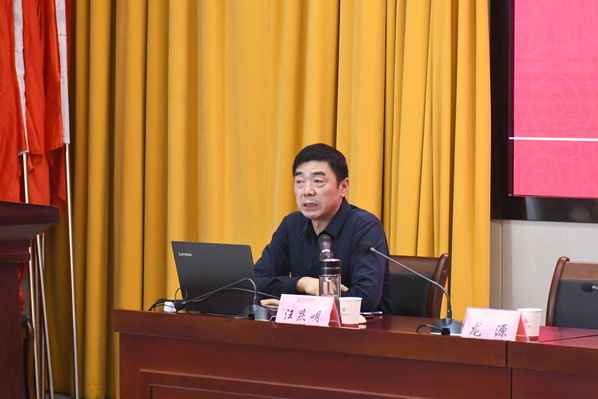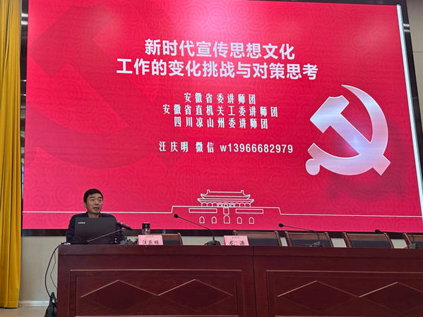 汪庆明从新时代宣传思想文化工作面临的严峻挑战、新时代新征程宣传思想文化工作的思考与对策等进行讲述,希望青年学生要有担当意识,团结成“一块坚硬的钢铁”,心往一处想、劲往一处使,推动中华民族伟大复兴号巨轮乘风破浪、扬帆远航。